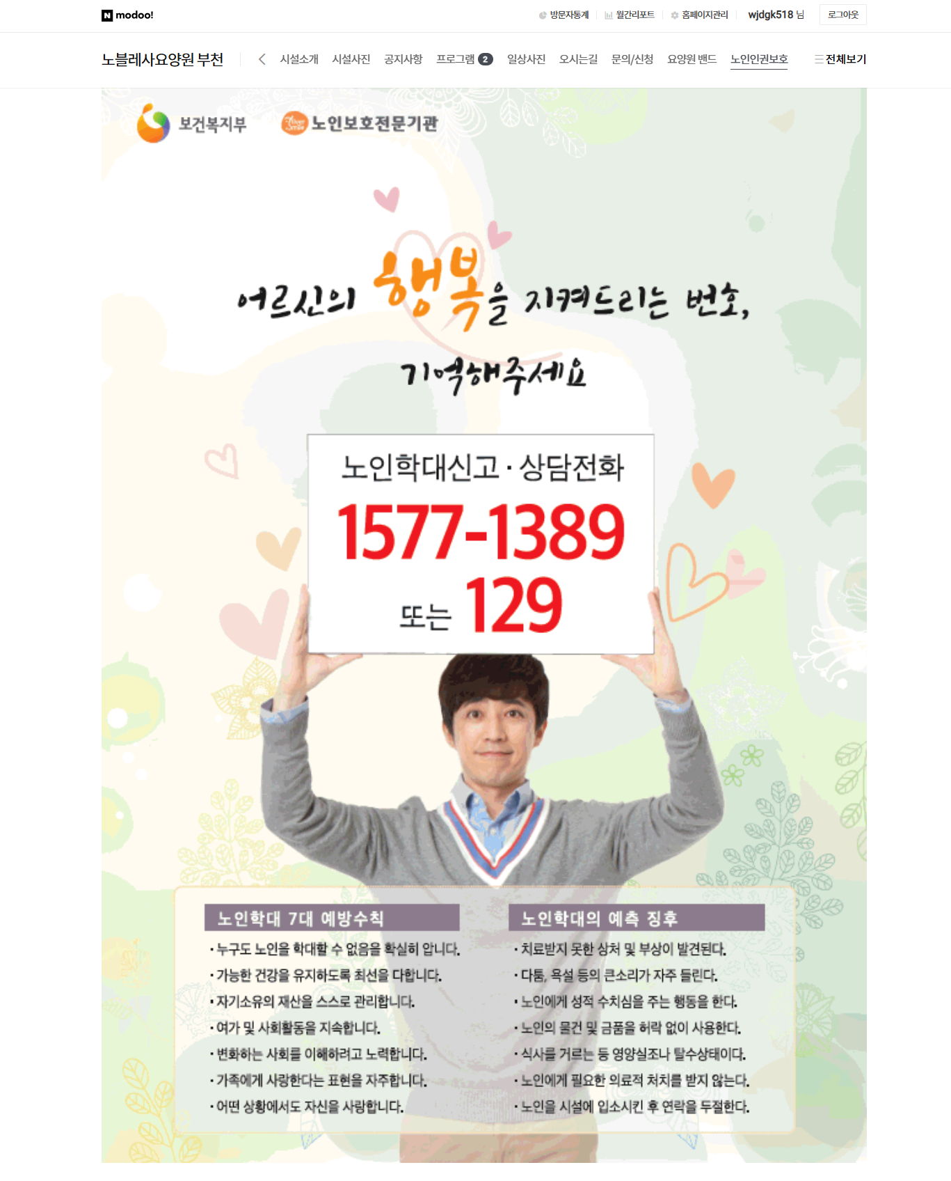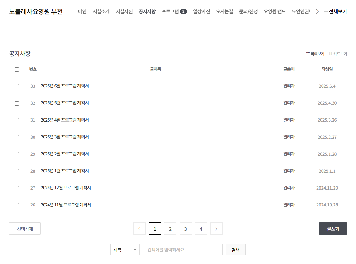 안녕하세요 노블레사요양원입니다. 노블레사요양원을 이용해주시는 보호자 및 가족 여러분께 진심으로 감사드립니다. 노블레사요양원 홈페이지를 네이버 모두엣으로 사용하고 있었으나 2025.06.26. 서비스 종료로 인해 홈페이지를 변경하게 되었음을 안내드립니다. 변경된 홈페이지주소: http://xn--o80bm8jxrf6zc90insbbm.kr/ (인터넷창에 "노블레사요양원.kr" 이라고 치시면 나옵니다) 변경된 홈페이지에서 다양한 소식과 서비스를 더욱 편리하게 이용하실 수 있습니다. 기존 홈페이지는 더 이상 운영되지 않으니, 즐겨찾기 또는 링크를 새 주소로 변경해주시기 바랍니다. 보호자님들께서는 평소대로 네이버 밴드(BAND)를 통해 매일 소식을 접해주시고 현재 보호자님은 아니지만 노블레사요양원에 관심을 가지는분들께서는 홈페이지에서 봐주시면 되겠습니다. 감사합니다. ![]() <변경 전 노블레사요양원 홈페이지> ![]() ![]() ![]() ![]() |