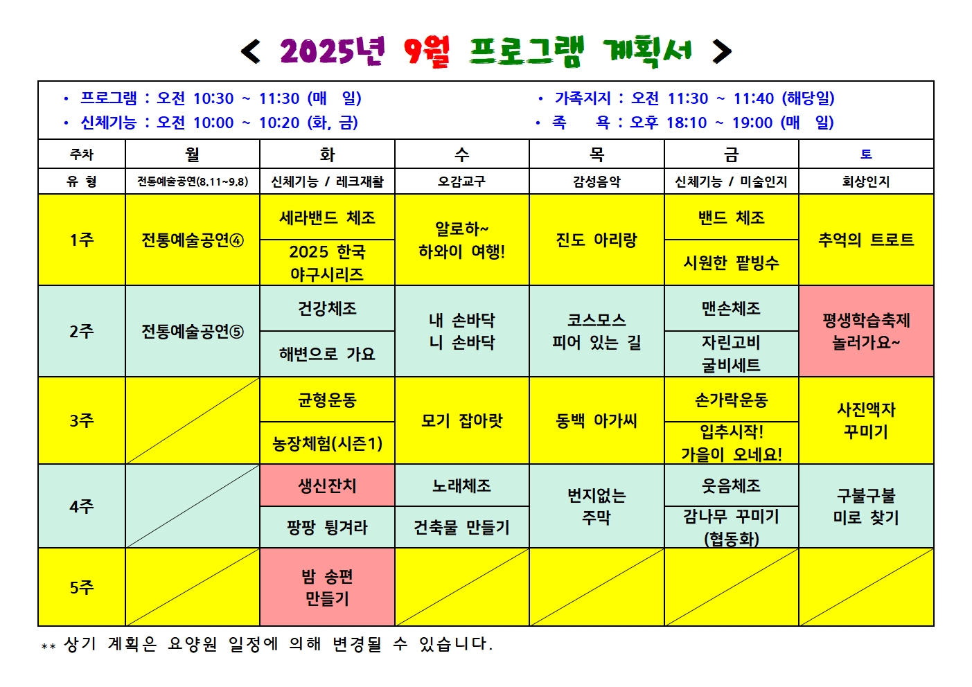 2025년 9월 프로그램 계획서 - 신체프로그램(주 2회) 10:00~10:20 - 인지프로그램(주 3회) 10:30~11:30 - 여가프로그램(주 2회) 10:30~11:30 * 전통예술프로그램(주 1회, 8/11~9/8 동안 총 5회 진행) * 지역사회연계-제19회 평생학습축제 참여 ![]() |