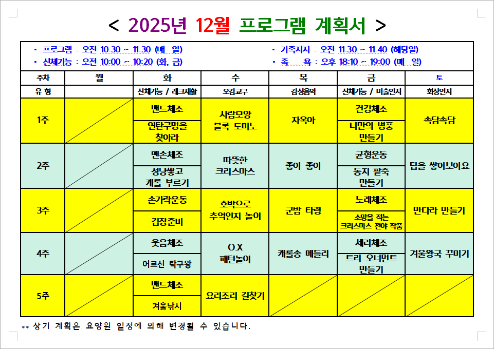 2025년 12월 프로그램 계획서 - 신체프로그램(주 2회) 10:00~10:20 - 인지프로그램(주 3회) 10:30~11:30 - 여가프로그램(주 2회) 10:30~11:30 ![]() |