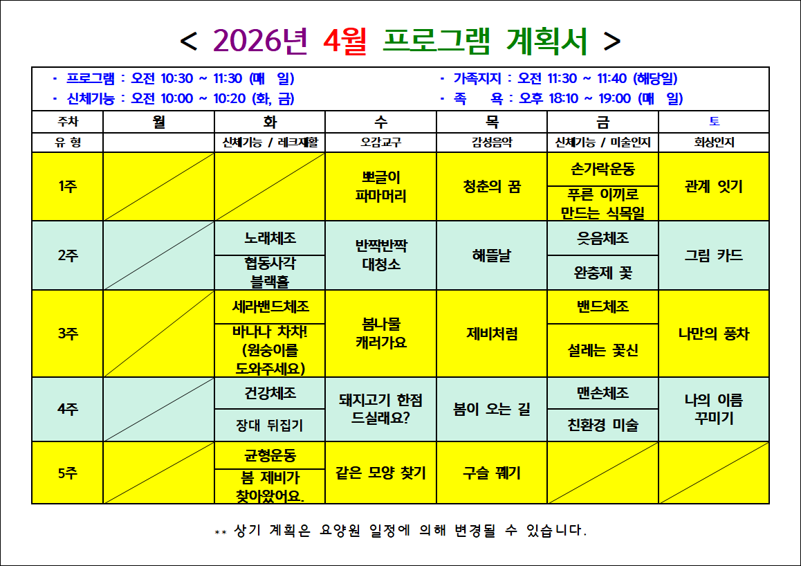 2026년 4월 프로그램 계획서 - 신체프로그램(주 2회) 10:00~10:20 - 인지프로그램(주 3회) 10:30~11:30 - 여가프로그램(주 2회) 10:30~11:30 ![]() |